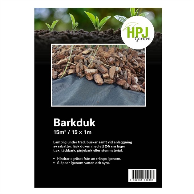 Täck duken med ett 2-5 cm lager med t.ex. täckbark, pinjebark eller stenmaterial.
